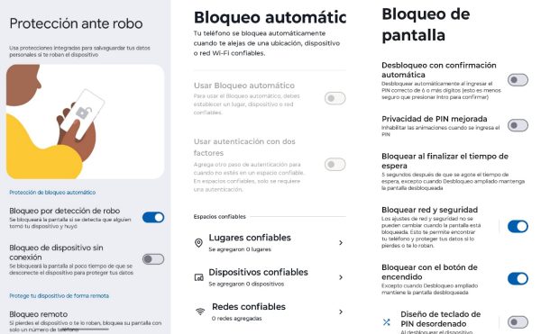 Theft Detection LockRemote Lock y Offline Device Lock están disponibles en la mayoría de los teléfonos Android 10+. Los ajustes Failed Authentication LockFactory Reset Protection y Protect Sensitive están disponibles en los dispositivos con Android 15.