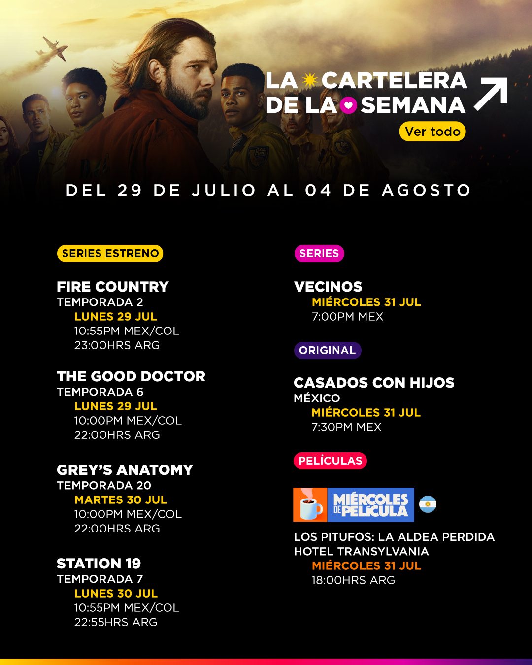 🎥 Fire Country – temporada 2: Nuevos episodios: todos los lunes, a las 10:55 p.m. COL / MEX Maratón – temporada 2 (sábado 10 de agosto, desde las 10:00 a.m. COL / 8:00 a.m. MEX)