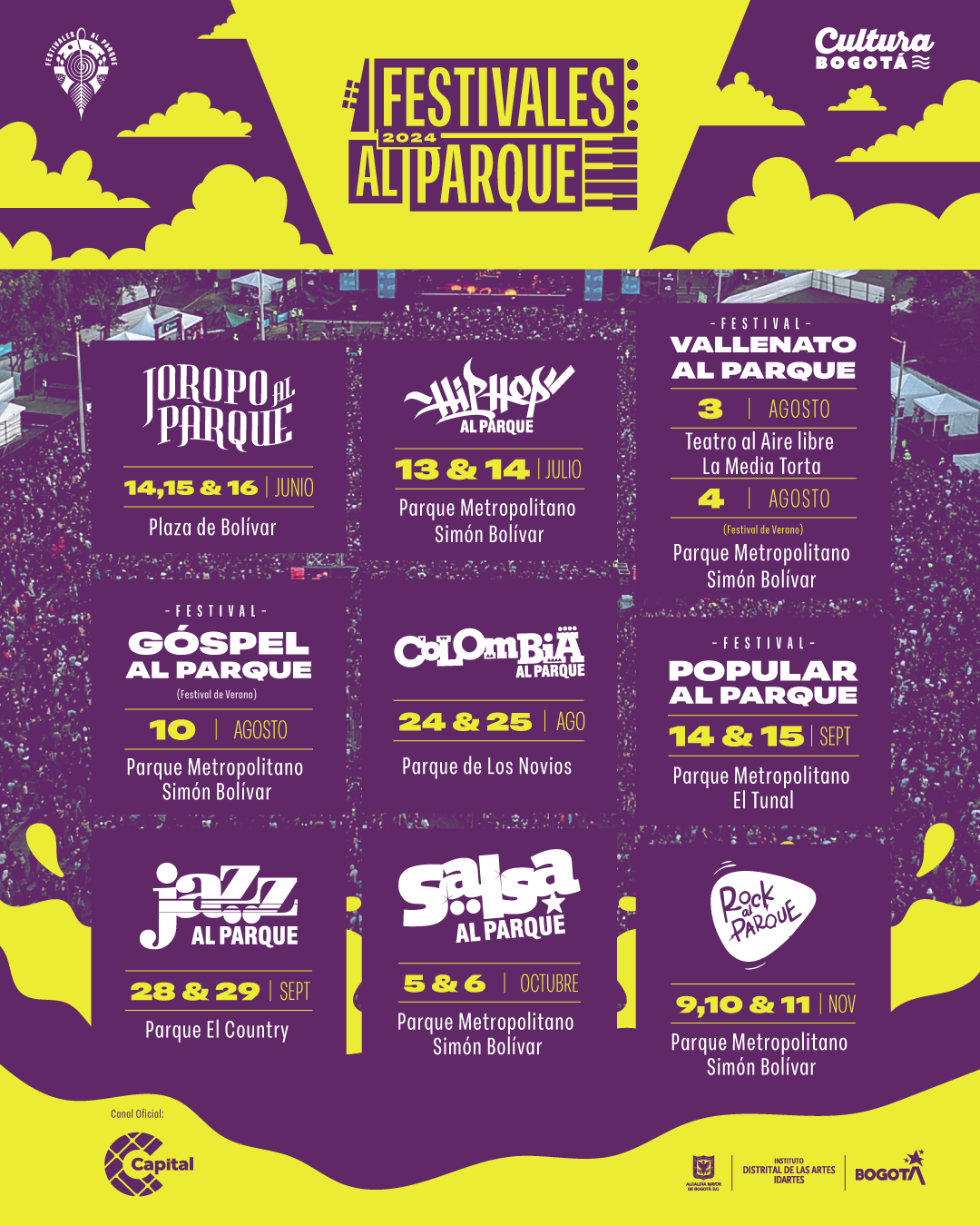 Se celebrarán un total de 9 festivales al parque diferentes, con diversos géneros musicales, espectáculos y presentaciones para que los ciudadanos y personas del exterior disfruten de una de las ciudades con mayor oferta cultural en Latinoamérica.