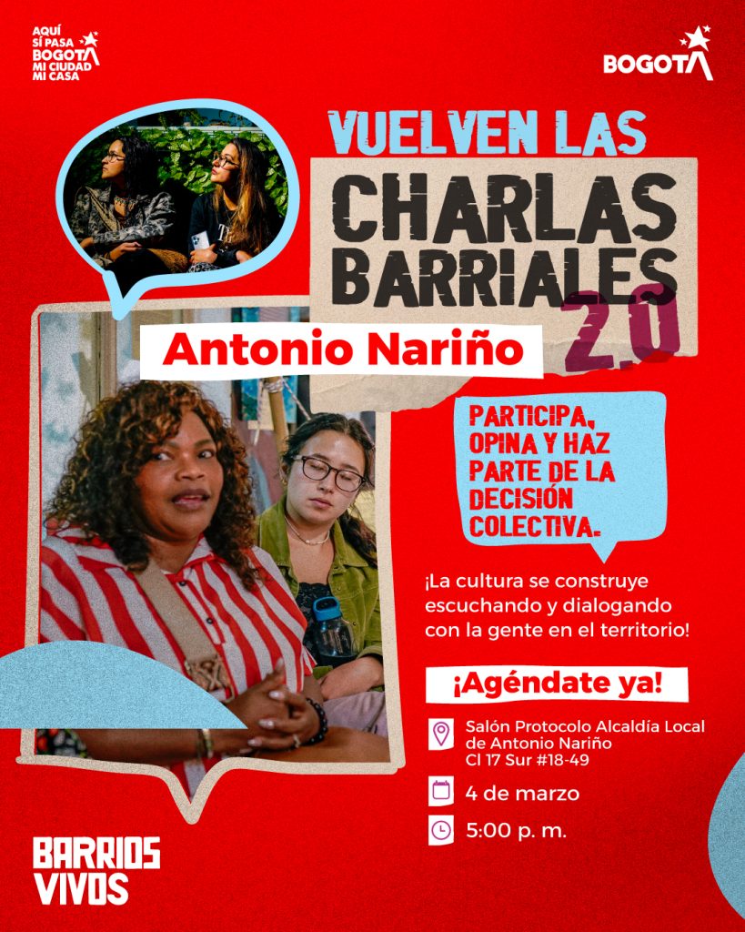 Vuelven las Charlas Barriales 2.0 y esta vez nos veremos en la localidad de Antonio Nariño. Es el momento de participar, opinar y ser parte activa de las decisiones que transforman nuestro territorio.
