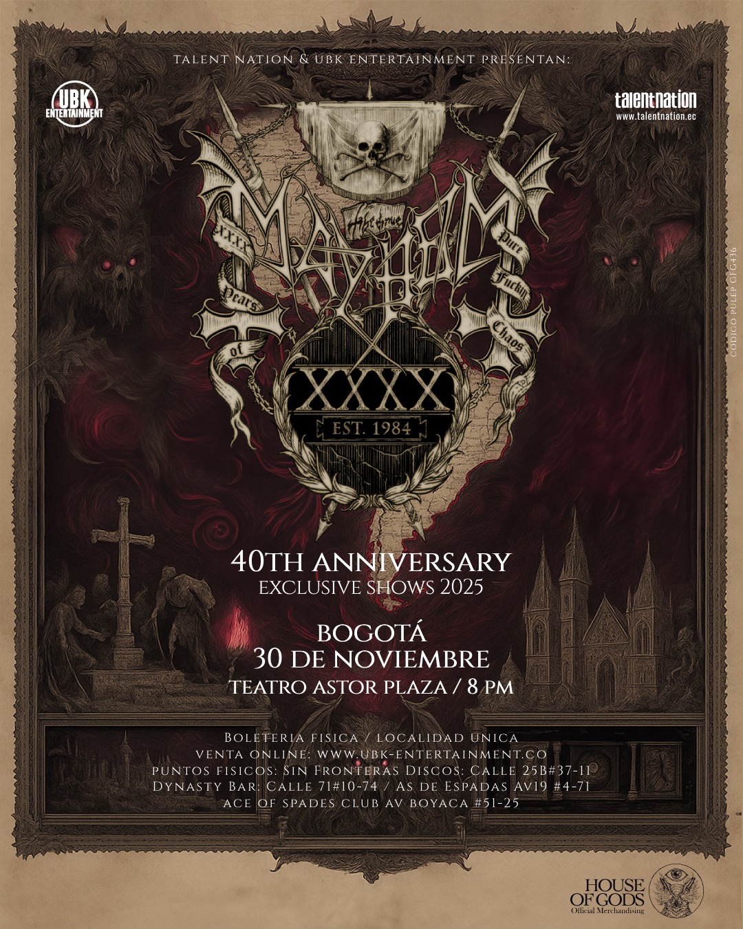 MAYHEM, el icónico y controvertido quinteto noruego que dio forma al black metal como lo conocemos hoy, confirma su regreso a Colombia con un show exclusivo en Bogotá el próximo 30 de noviembre de 2025 en el Teatro Astor Plaza. Una oportunidad única para presenciar en vivo a una de las bandas más influyentes, polémicas y extremas en […]