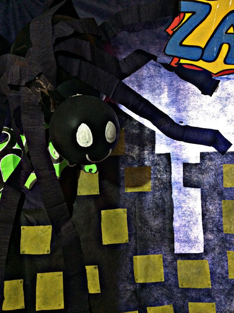 Para nuestra gran araña, usaremos dos bombas negras, una la inflaremos más pequeña que la otra, procedemos a unirlas. Para sus patas, cortaremos cuatro tiras del papel crepé negro y, por último, las pegaremos en nuestro castillo.