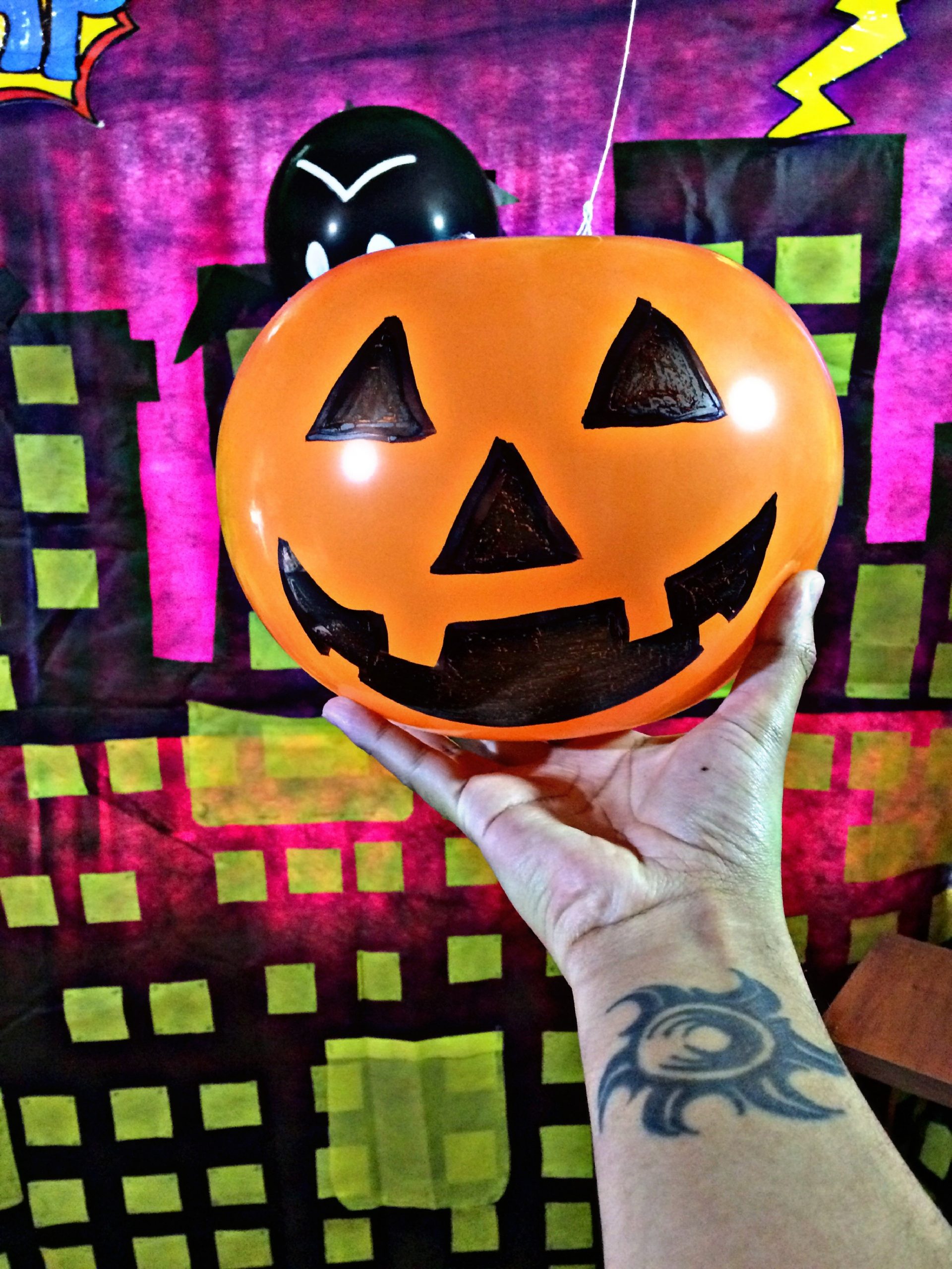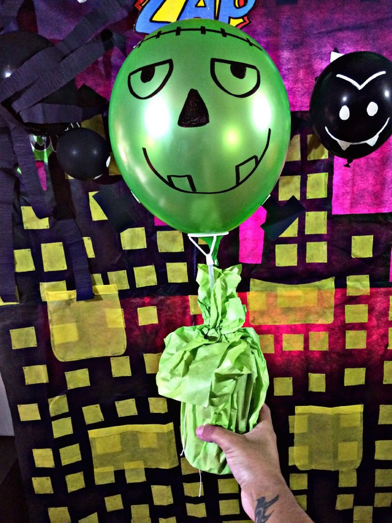 Inflamos la bomba de color naranja, cogemos la cola de la bomba y cuidadosamente la llevamos al centro, le pedimos el favor a alguien que nos colabore haciéndole el nudo con la pita, para que nuestra calabaza tenga forma ovalada. En seguida, procedemos a decorarla con el marcador negro.