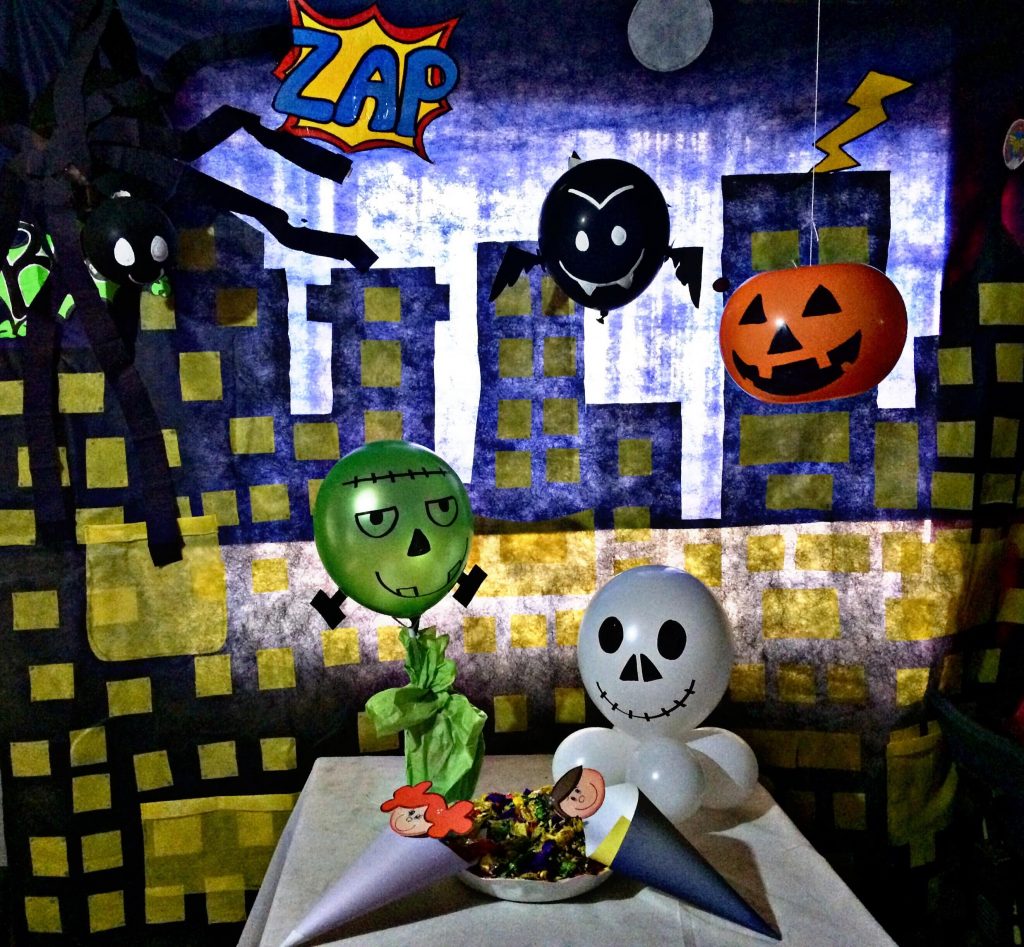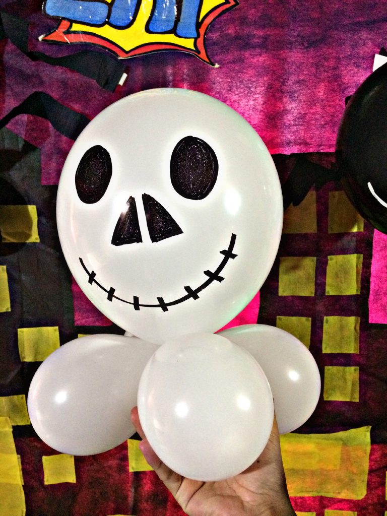 Para nuestro fantasma usaremos una bomba R12 color blanco y cuatro R6, las inflamos y las unimos entre sí, luego procedemos a decorar su rostro, y ya quedó nuestro centro de mesa.