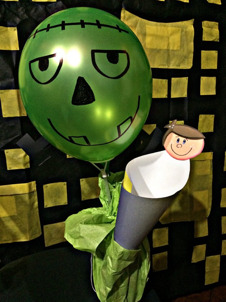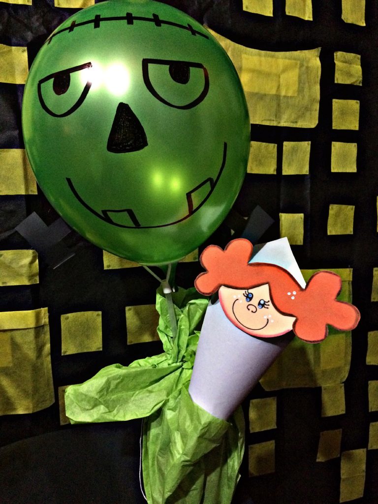 Inflamos nuestra bomba verde, la aseguramos en el palo de globo, decoramos su cara, y con la ayuda de la silicona la pegamos el tarro, con el papel seda verde y con cinta lo envolvemos, por último, sobre la cartulina negra dibujamos los tornillos, recortamos y se lo pegamos en la parte inferior de la bomba.