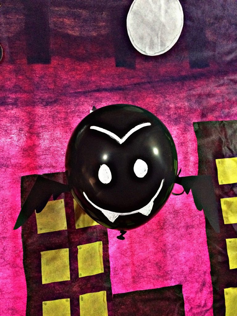 Para nuestro murciélago, inflaremos la bomba de color negro, y con cartulina haremos sus alas para que vuelve muy alto. Las recortamos y se las pegaremos en la parte inferior del cuerpo, por último, usaremos la tempera de color blanca o el corrector y le haremos su cara.