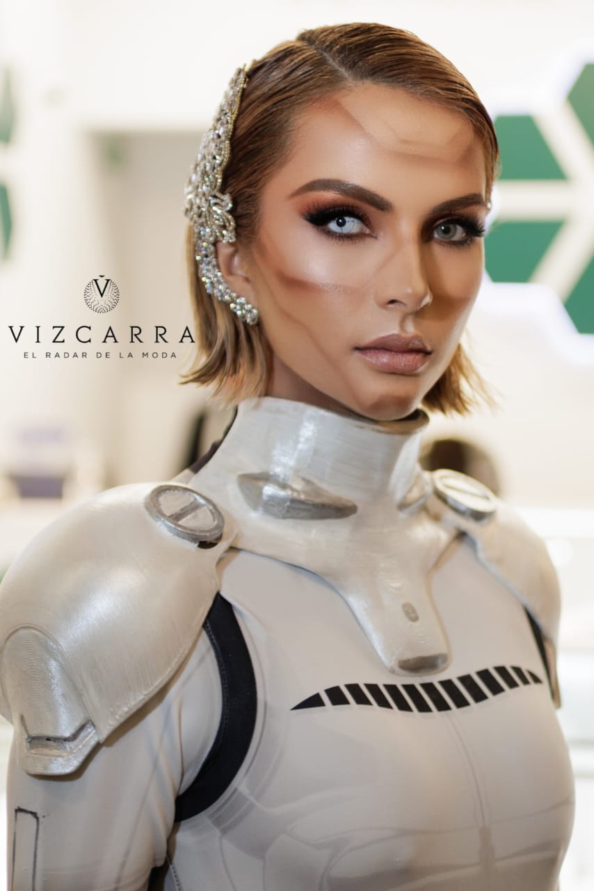 La colección Humaine es una declaración estética que mezcla el alma de la joyería artesanal con la potencia de la inteligencia artificial. El momento más impactante de la noche fue la aparición de una modelo humanoide —una figura robótica con rostro femenino y silueta futurista— que desfiló como símbolo de una nueva era en el diseño de joyas. Su estilismo, acompañado por piezas exclusivas de Vizcarra en tonos metálicos y cristalinos, evocó el poder de la tecnología fusionada con la belleza humana.