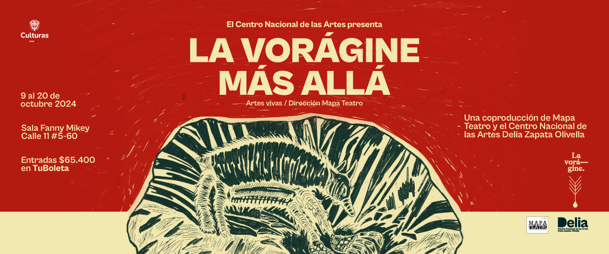 El mes de octubre será el estreno de La Vorágine Más Allá, una obra de artes vivas coproducida por el Centro Nacional de las Artes Delia Zapata Olivella (CNA) y el laboratorio de artistas de Mapa Teatro. Esta nueva versión de La vorágine pone en escena algunas páginas específicas de la novela de José Eustasio Rivera, a través de una reinterpretación que desafía las narrativas tradicionales y que se estará presentando en la Sala Fanny Mikey.