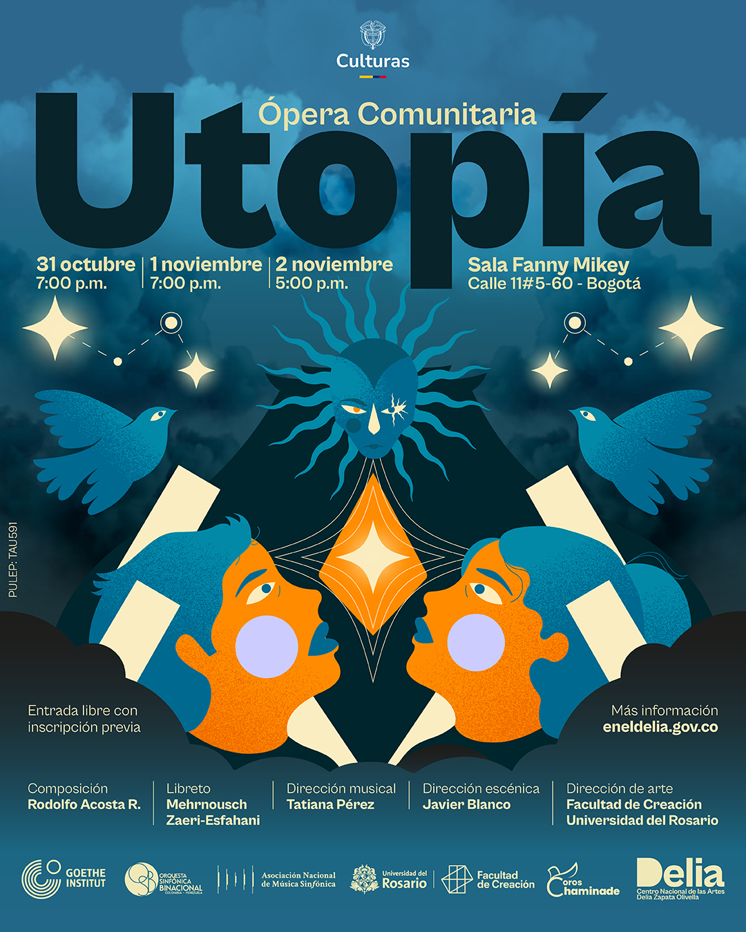 Bajo la dirección de Zaeri y la composición de Rodolfo Acosta, ganador de la convocatoria de estímulos 2023, ‘Utopía’ explora temas de esperanza y reconstrucción en un contexto de conflicto. La ópera integra dos coros comunitarios: uno infantil de la Fundación Chaminade y otro de jóvenes y adultos, el Coro Comunitario Intercultural del Centro Nacional de las Artes. Además, participará la Orquesta Binacional y otros reconocidos artistas escénicos, entre los que se encuentran la soprano Beatriz Elena Martínez, la mezzo-soprano Juana Monsalve y el cantante y compositor Juan Manuel Bernal.